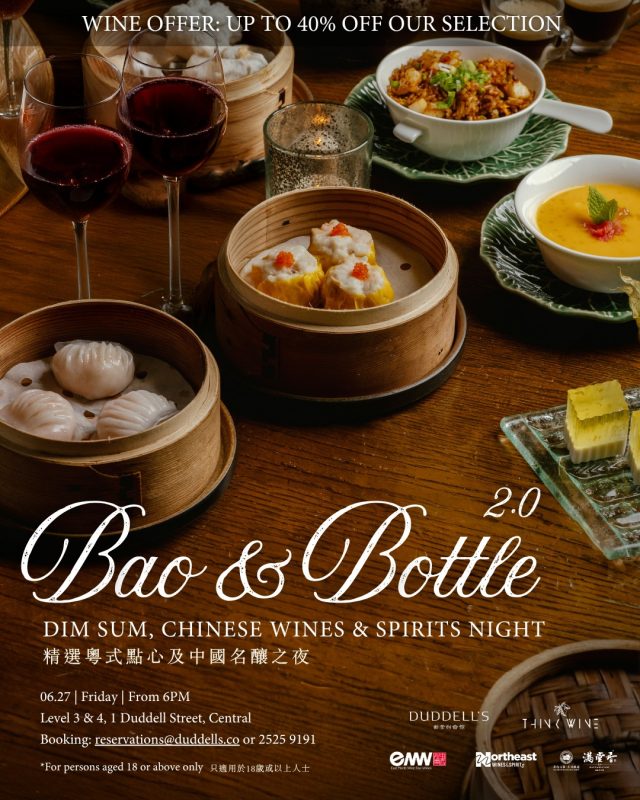 Duddell’s proudly presents the return of Bao & Bottle, this time spotlighting premium Chinese wines and spirits in collaboration with @thinkwinemerchant, @northeast_hk, @emwfinewineshk and @mtx.baijio. For one night only, we are offering up to 40% OFF the curated selection of bottles, allowing you to discover unique flavours at an exceptional value, each perfectly harmonised with our classic dim sum selection, with Cantonese delicacies available a la carte.